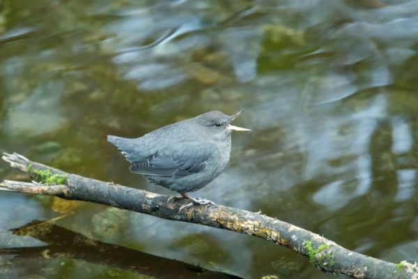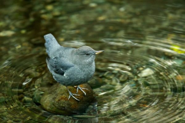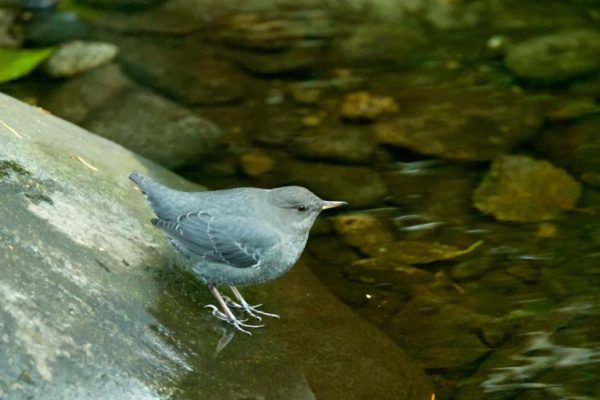 The American Dipper is gray and plump, an aquatic songbird that inhabits western rivers and streams from Alaska to Central America. This is a bird that can’t stand still. It is usually noticed by its continual bobbing while standing on a rock at the edge of or in a stream.