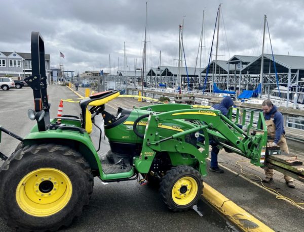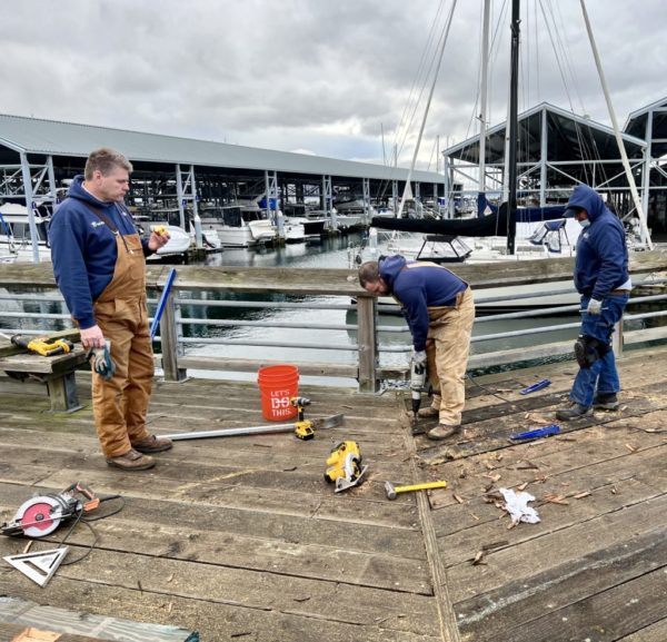 Photographer Julia Wiese noticed Tuesday that these Port of Edmonds employees had part of the boardwalk blocked off. Working in the cold, windy weather, they were in the process of replacing worn-out boards. Asked how many they have replaced, employee Travis replied, “130 and we have about that many left to go.”