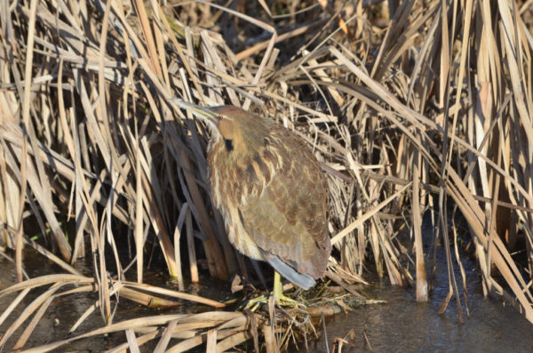 When approached, the American Bittern will extend its neck, point its bill upward, and sway its neck gently as if it is a reed in a light breeze. There are a number of collective nouns for a group of bitterns, including dash, freeze, pint, pretense and siege. A freeze of bitterns seems most apt.