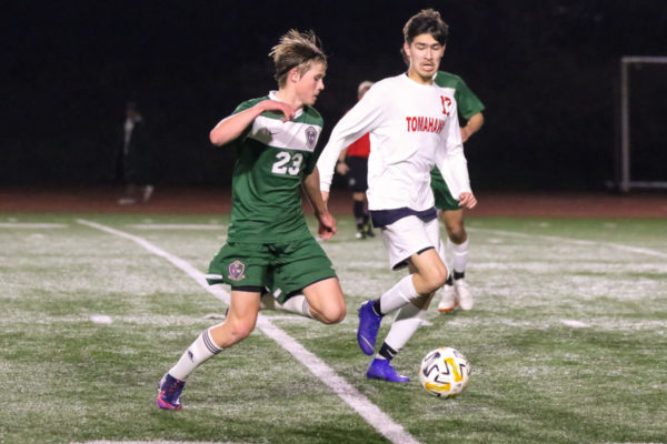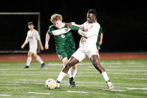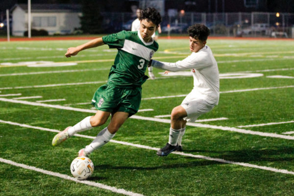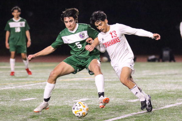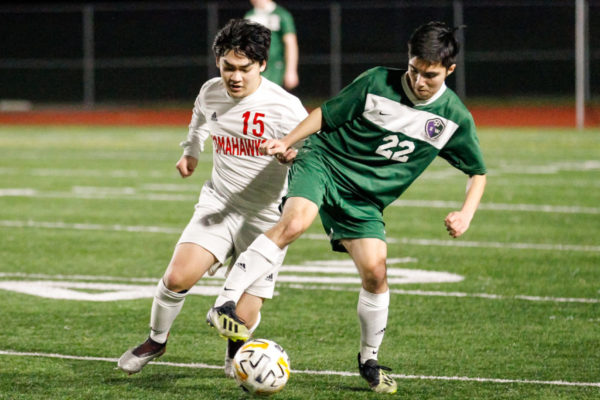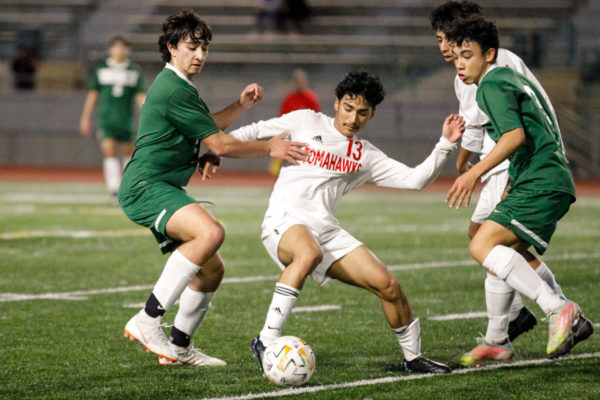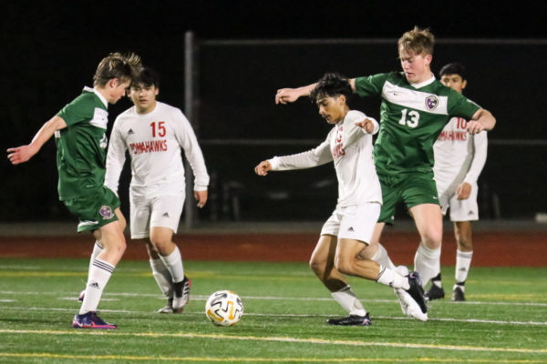 E-W defenders Raghavendra Raghhu (5) and Richard Duncan (3) vs. Marysville-Pilchuck’s Jose Goves Lopez (13).