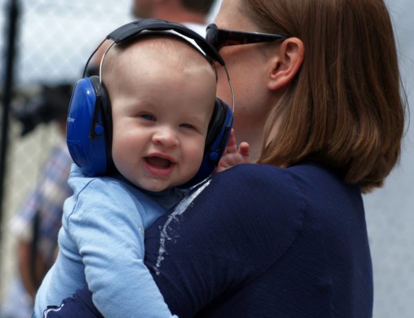 A baby ready to see the plane show on Flying Tigers Day in June 2013.
