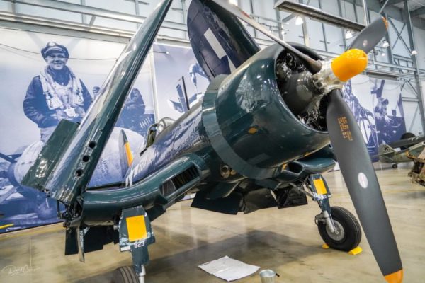 Goodyear FG-1D Corsair. Per the museum: “The Corsair was one of the most outstanding fighter-bombers of World War II. The inverted gull wing design allowed the mating of a large propeller with the huge radial engine, while keeping the overall height of the aircraft within the limitations imposed by carrier use.”