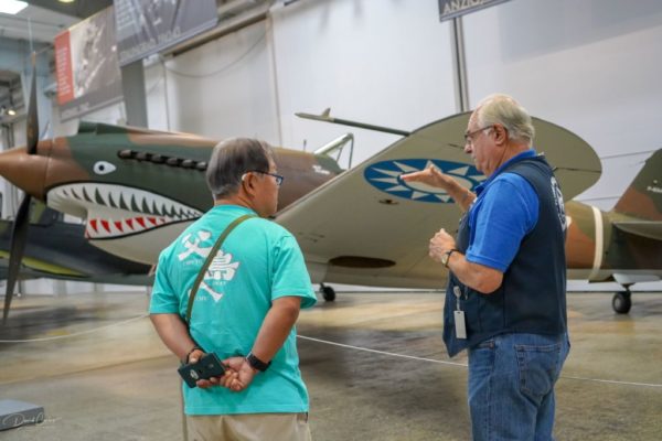 A museum volunteer in July 2019 shows a Curtiss P-40C Tomahawk to a visitor. He said, “They all had different characteristics–all the airplanes–they had advantages and disadvantages. They had weaknesses and strengths. As a pilot, you had to figure out your opponent’s weakness.”