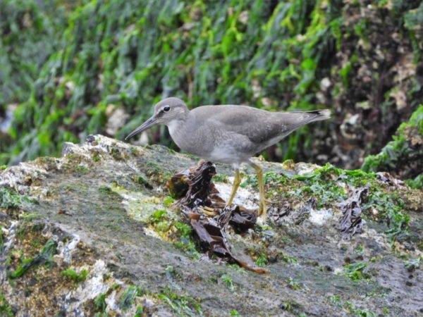 “Wandering” refers to the widespread occurrence of this species on islands across the Pacific Ocean. “Tattler” refers to its voice, which it uses to alert other birds to a hunter’s presence. There does not appear to be any collective noun for this species, probably because it does not form large flocks. Single birds sometimes can be found foraging with Black Turnstones and Surfbirds, two species frequently seen on the Edmonds Marina breakwaters in fall and winter.