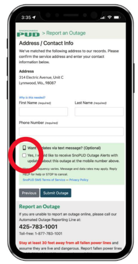 Customers can opt-in to text alerts through the PUD’s outage map and self-service phone system. To receive text alerts, report your outage on the PUD’s outage map and click the box (see photo) to opt-in to outage text alerts. On the phone, call 425-783-1001 and opt-in to text alerts when you report your outage.