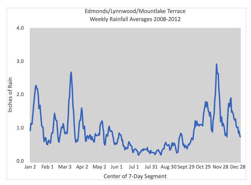 Here is what the historical record shows about rain in the Edmonds/Lynnwood/Mountlake Terrace from 2019-2023: