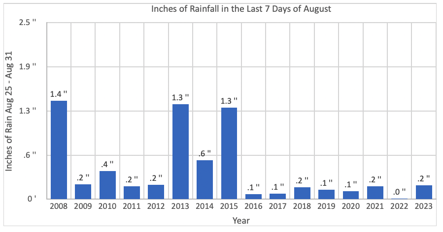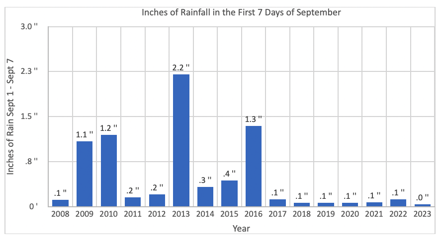 A common rule is that vegetable gardens need watering if there has been less than an inch of rain in the last week. From 2008-16, there were four years when you did not have to water on Sept. 7. From 2017-23, there was a consistent 0.1 inches of rainfall each year in the first week of September. From 2017 to now, you had to water every Sept. 7.