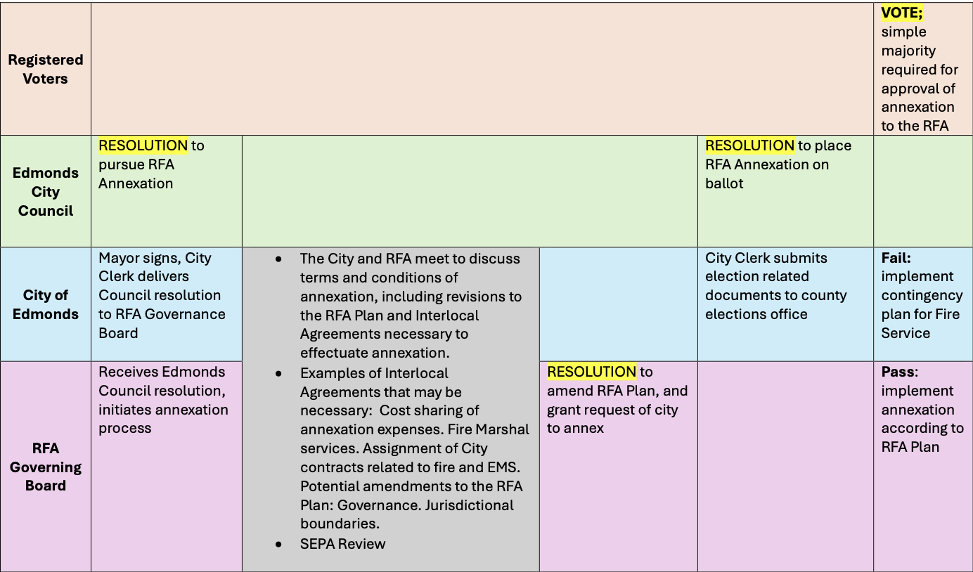 Council assistant Beckie Peterson then went over the workflow for RFA annexation, which starts with the council submitting a resolution that it intends to pursue annexation. At that point, the city and the RFA meet to discuss terms and conditions of annexation, which includes updating contracts and agreements. After that, the RFA grants the city’s request to annex and the resolution is placed on a special election ballot for voters to decide.