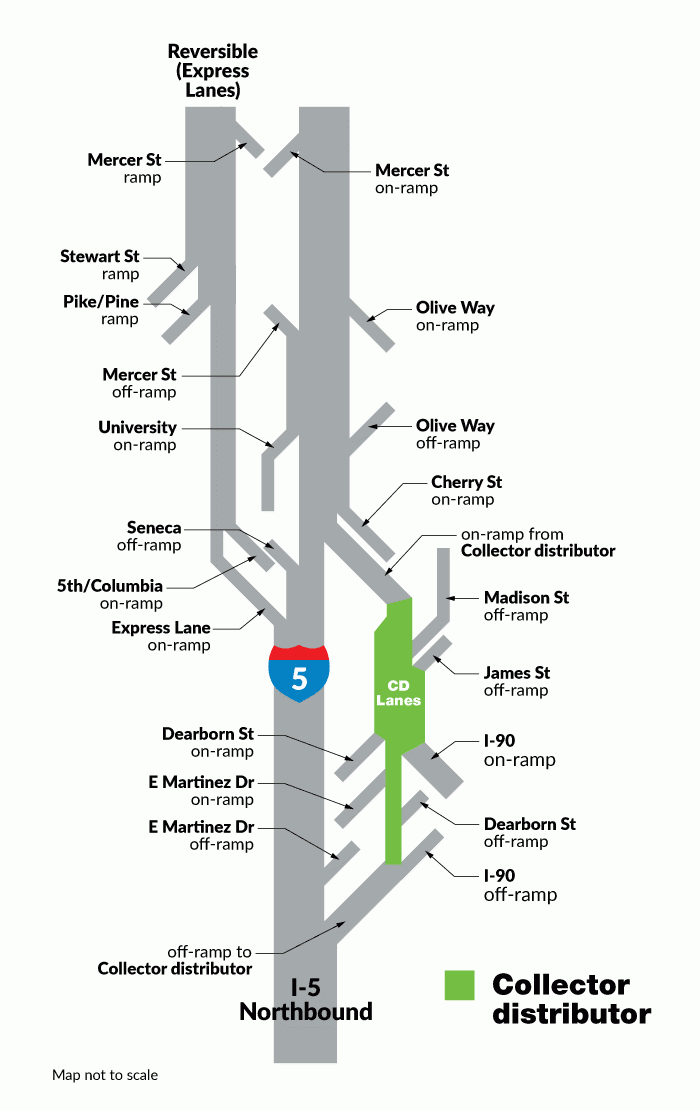 People who rely on northbound Interstate 5 through downtown Seattle should plan for nightly closures of the collector/distributor lanes from I-90 to Olive Way nightly between 11:59 p.m. Monday, July 22, and 4 a.m. Thursday, July 25, the Washington State Department of Transportation (WSDOT) said. The westbound and eastbound I-90 ramps that connect travelers to northbound I-5 also will close. Drivers can use a detour to connect to northbound I-5.