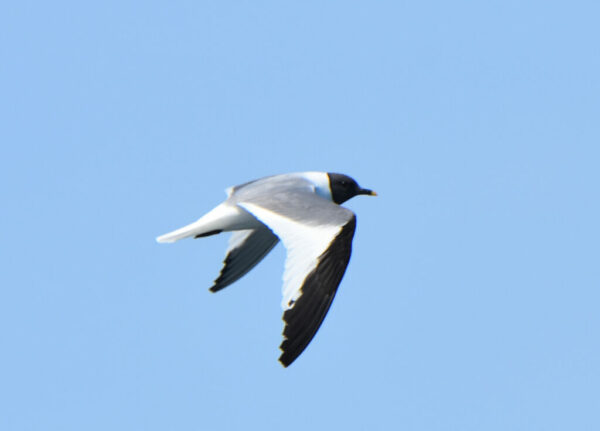 The Sabine’s Gull is a common migrant off the West Coast but is rare inland. When seen in Puget Sound, it is usually September and early October. There have been several sightings on the Edmonds waterfront over the years of both adult and juvenile birds. The tricolored pattern of the wings is distinctive and should be noticeable even to a nonbirder if the gull flies in close enough to shore. Examples of a couple of rare inland sightings include an adult in breeding plumage in September 2024 at McNary National Wildlife Refuge in Walla Walla County and a juvenile at the Cedar River mouth in Renton in October 2016. In late May 2022 an Edmonds ferry rider photographed a migrating flock of 26 Sabine’s Gulls northbound in Snohomish County waters.
