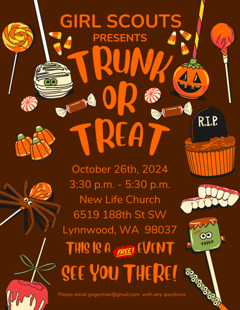 The Girl Scouts are hosting a Trunk or Treat event from 3:30-5:30 p.m. Saturday, Oct. 26 at New Life Church, 6519 188th St. S.W., in Lynnwood.