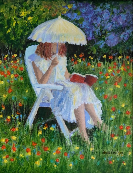 Leanna has been painting since she was 3 years old. As exuberant as her delightful, richly colored and whimsical paintings, Leanna says, “My mom was always very supportive of my drawing and watercolor painting I used to come to her with every single picture for approval and she always said ‘Very nice, good job!’ My mom never painted herself but she liked buying art books. The most influential for me were those on the Renaissance and French Impressionism.”