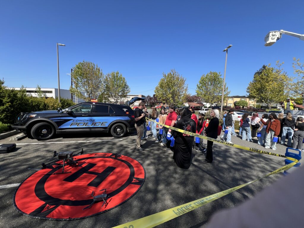 Meanwhile, the Edmonds Police Department provided a demonstration of its drone technology, used in search and rescue operations and other emergency responses. Students watched closely as the officer explained how these tools enhance public safety and efficiency.