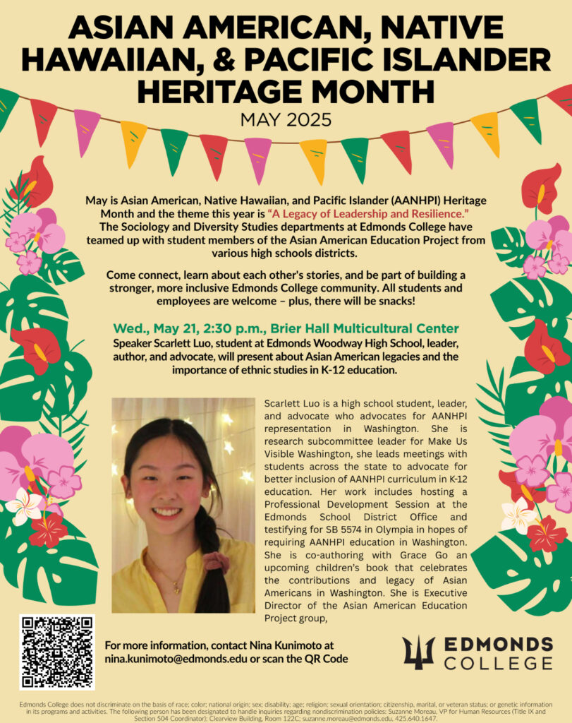 May is Asian American, Native Hawaiian and Pacific Islander (AANHPI) Heritage Month. Edmonds College’s Sociology and Diversity Studies departments partnered with the Asian American Education Project to host events to “learn about the incredible contributions of AANHPI individuals,” according to the Edmonds College website.