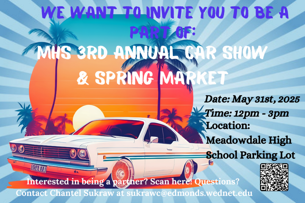 Meadowdale High School’s Family, Career and Community Leaders of America (FCCLA) and Skills USA Automotive Club are planning their third annual car show and spring market from noon-3 p.m. on Saturday, May 31 in the high school parking lot, 6002 168th St. S.W., Lynnwood.