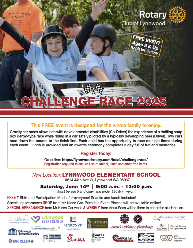 Rev your engines for Lynnwood Rotary Club’s eighth annual Challenge Series Derby Car Race – a day of speed and fun for children of all abilities. The race is scheduled for Saturday, June 14 from 9 a.m. to noon at Lynnwood Elementary School: 18614 44th Ave. W.