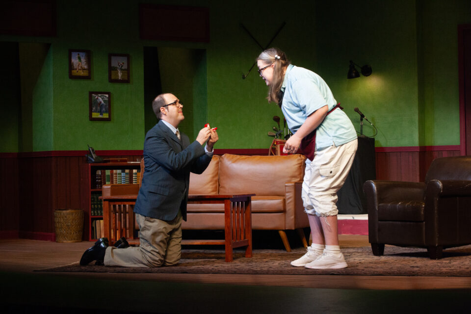 Brandon Jepson (Justin) leads the cast as a young jittery club employee at Quail Valley Golf with a secret romantic agenda. Jepson’s exaggerated performance channels the spirit of classic farce. Megan McDermott (Louise) makes her debut with EDP and earns laughs with her mix of wide-eyed innocence and over-the-top drama – like during her meltdown over a lost engagement ring. The pair is adorkable and equally endearing; their quirky personalities are perfectly matched.