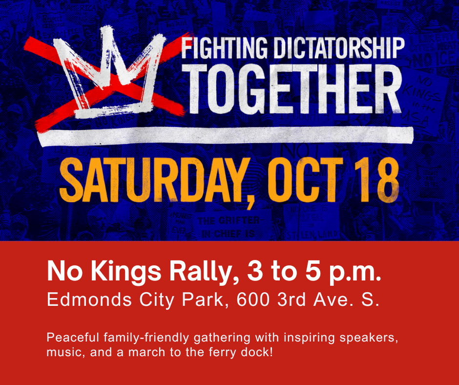 Following a rally that drew an estimated 4,500 people to Edmonds in June, the South Snohomish County Indivisible group is hosting a “No Kings II” Rally from 3-5 p.m. on Saturday, Oct. 18 at Edmonds City Park.