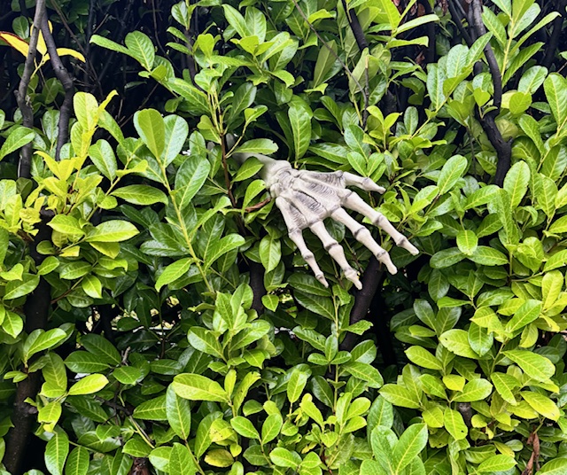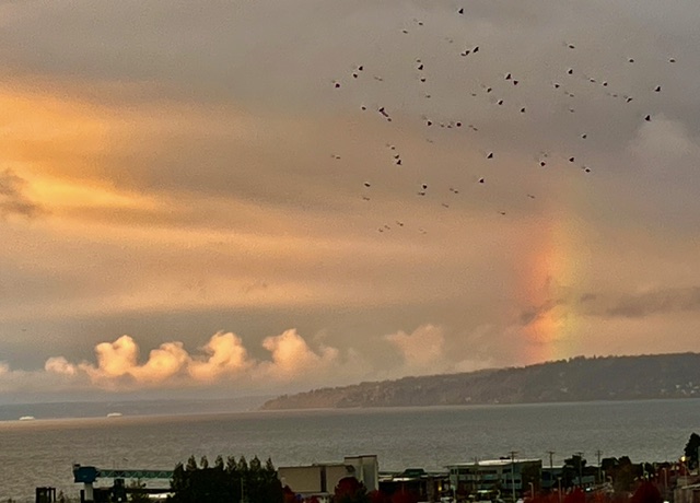 Love the rainbow and the marching clouds! Clouds running away from the skeleton hand!