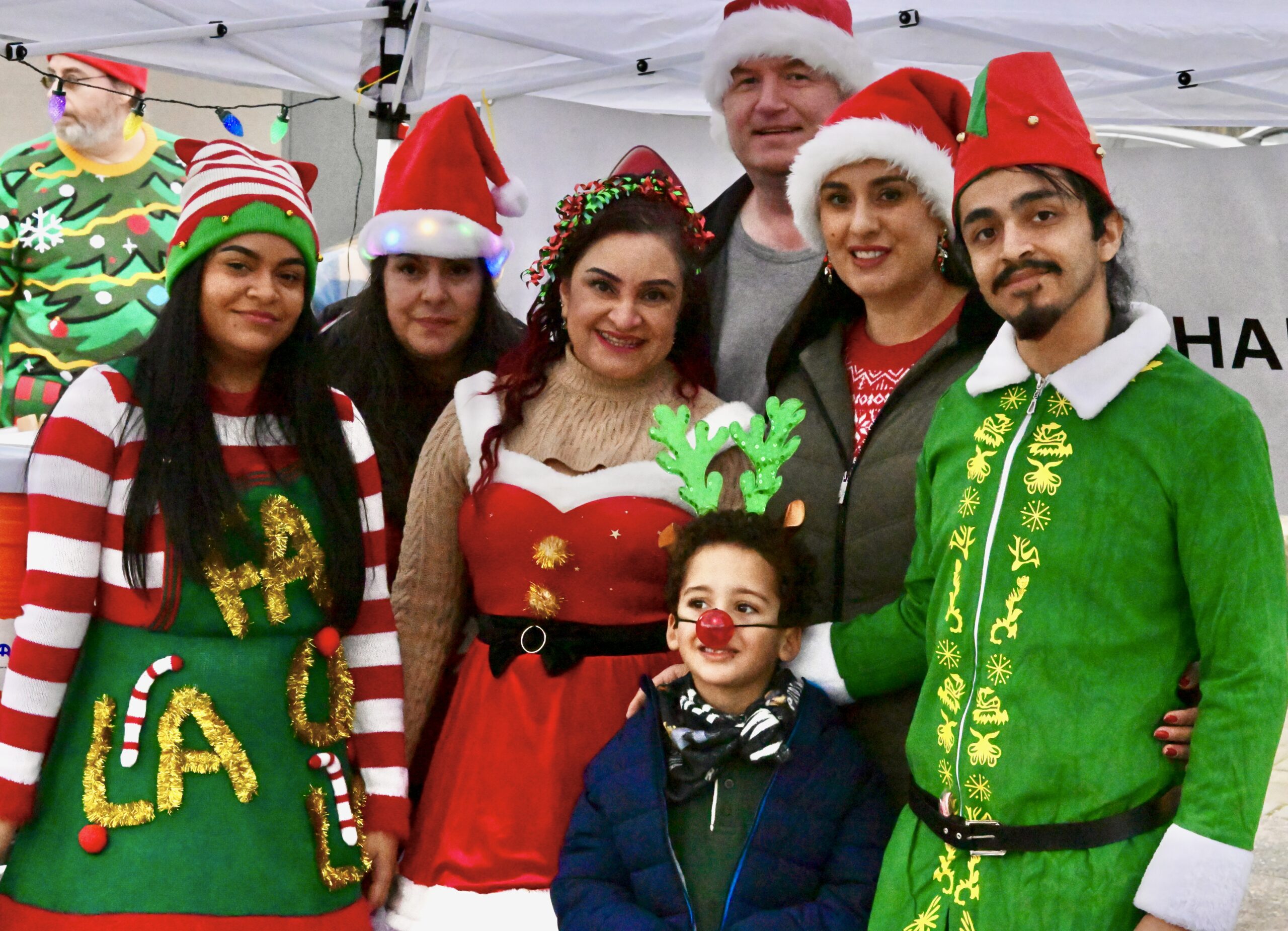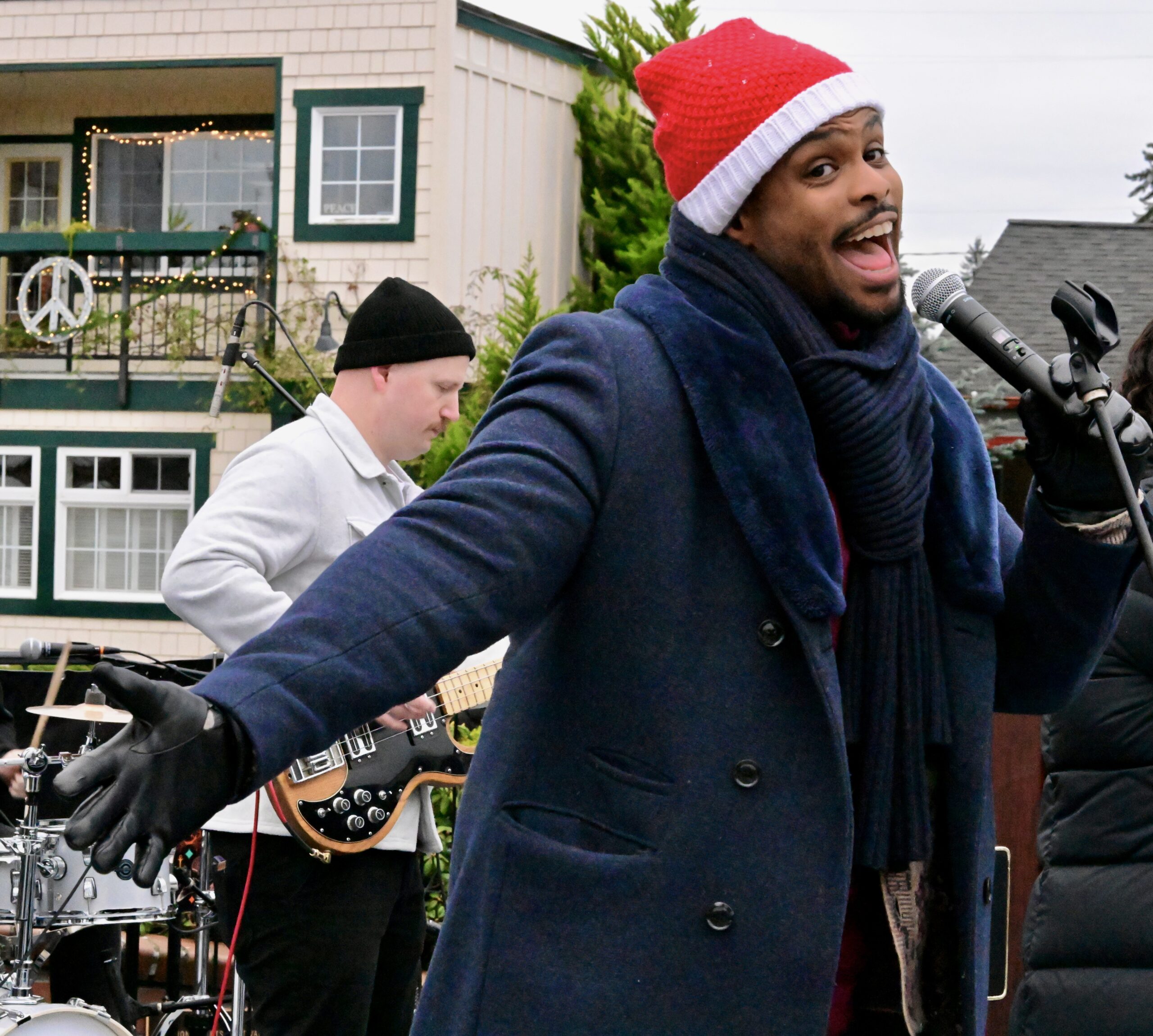 Edmonds Best Western staff posing as Santa’s elves hand out hot cocoa, candy canes and smiles.Members of the band All The Other Reindeer joyously sings holiday tunes.Emcee Richard Taylor Jr. revs up the crowd.A busy crowd of all ages fills the streets as Edmonds Chamber of Commerce President and CEO Ryan Crowther, center front, awaits the start of festivities.Genevieve, in a festive dress, dances with her dad Eli Roque.A customer picks up a buttermilk pastry and coffee at The Crumpet Shop booth.Siblings Ezana and Sofia pose with Santa, who stopped by early for photos.Alana makes a snowflake ornament at the Edmonds Chamber Foundation table.Children gather close to the stage for a better view as they wait for Santa.Members of the North Sound Choir belt out Christmas carols.Young choir singers from North Sound Church add sweet voices to the group.Parents help their children create holiday crafts at the Spark Creativity booth.Edmonds Food Bank donations were collected during the event and Executive Director Casey Davis thanks the Edmonds community for its generous support.The tree is lighted as music plays and Santa addresses the crowd.Emily the Elf loves this time of year.