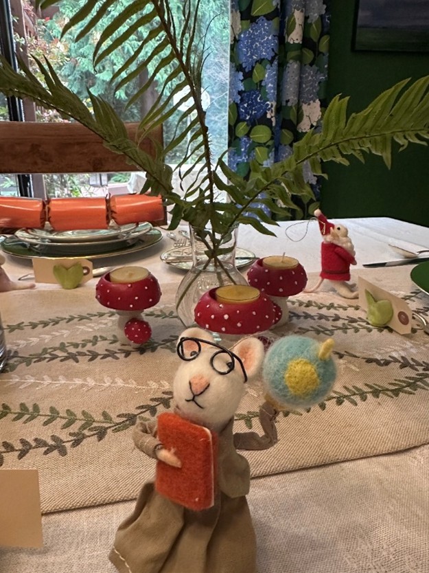Arrange the materials down the center of your table around some larger sticks or branches, add candles or mushroom-shaped accents, and you have created a woodland wonderland. I added a few felt mice ornaments to mine, which I hope will amuse my guests and we can hang them on the holiday tree later.
