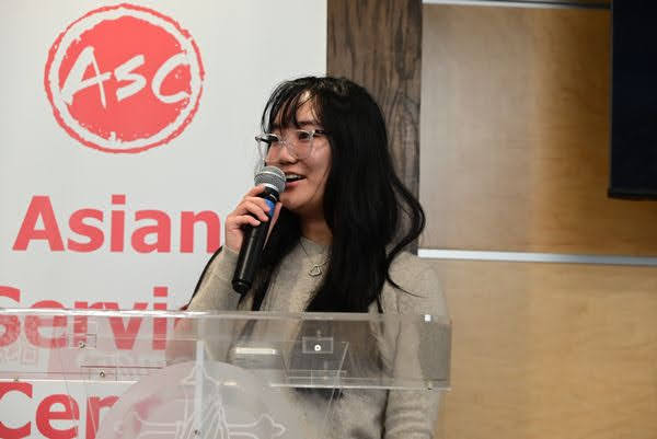 Edmonds City Council student representative Vivian Liao greets attendees and introduces Chen and Barnett.