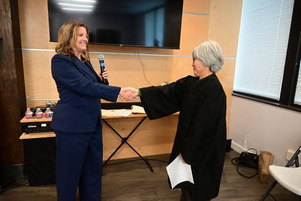 Judge Bui then administered the oaths of office, officially swearing the two in as councilmembers. Note that while ceremonial oaths are scheduled for the first Edmonds Council meeting in 2026, Saturday’s actions officially installed Barnett and Chen as councilmembers for the next four years. Judge Tam Bui congratulates Erika Barnett on her new position.