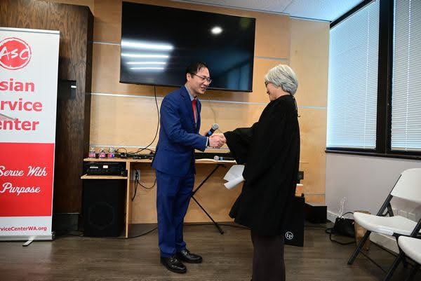 “I look forward to working alongside my fellow councilmembers and with all of you to strengthen what makes Edmonds such a remarkable place to live,” she said. “We may not agree on every issue, but I am confident that when we anchor our work in respect, transparency and commitment to the common good, we will find our way forward. Thank you again for the trust you’ve placed in me. I’m honored to serve, and I’m excited for what lies ahead.” Judge Bui congratulates Will Chen.