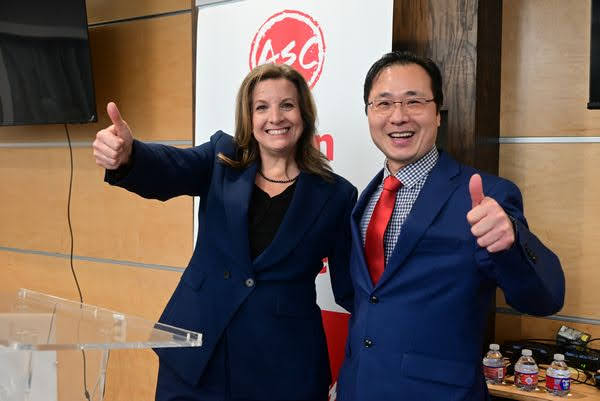 Councilmembers Erika Barnett and Will Chen flash a confident thumbs up as they thank attendees and close the event. (Photos by Larry Vogel)