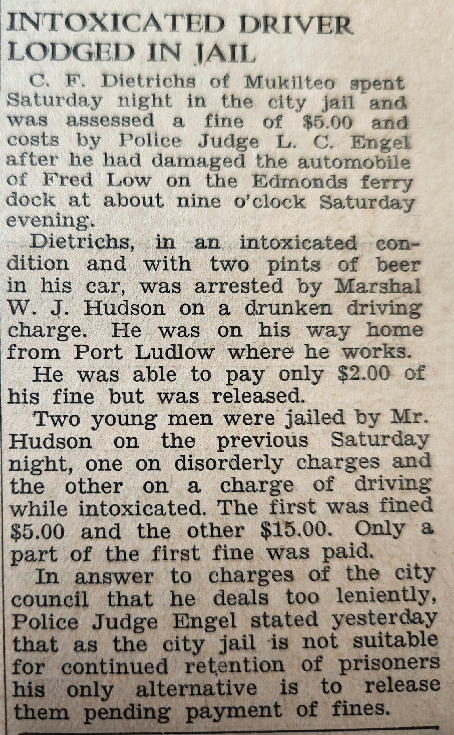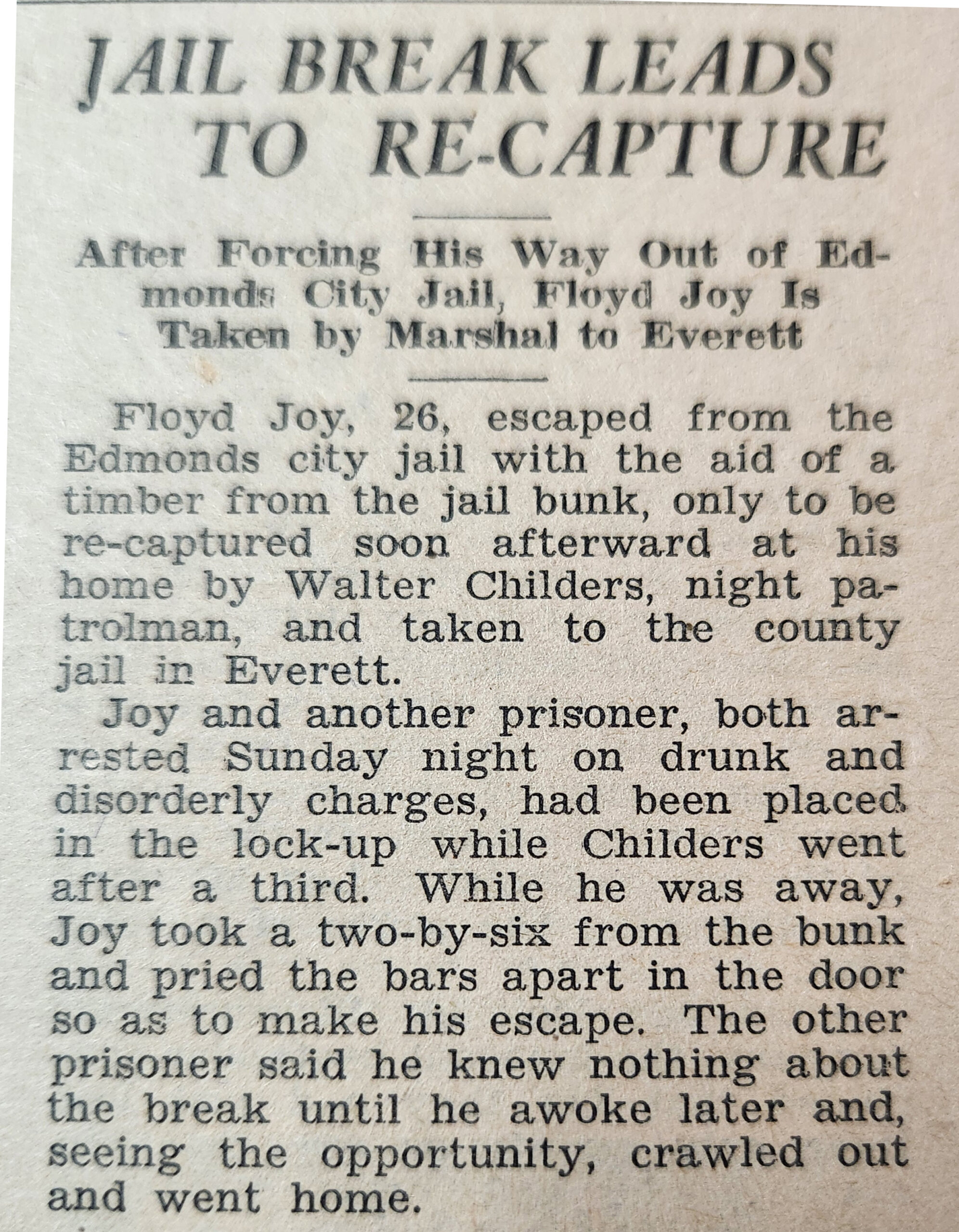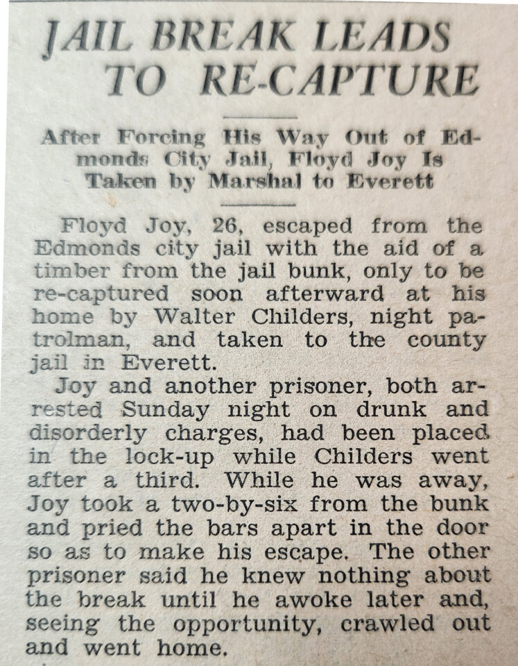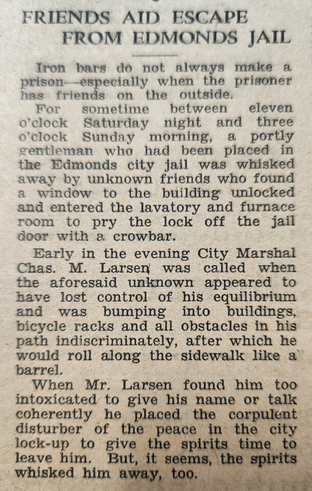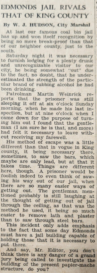 In a separate tongue-in-cheek article in the November 1932 edition of the Edmonds Tribune-Review, written by Edmonds City Marshal W. J. Hudson, it was stated that the Edmonds City Jail rivaled the King County Jail for its “break-proof” nature. But as Hudson pointed out, you didn’t have to cut through the iron bars at the Edmonds jail, you could just escape through the ceiling, as a prisoner had done the previous week.