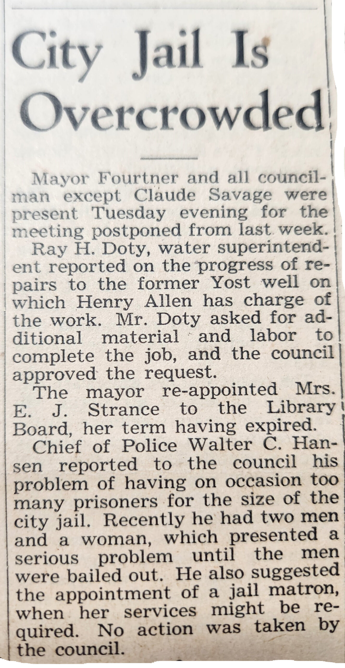 The report read: “The first matter was the consideration of a bill for $2 for last month’s lighting bill at the jail. Inasmuch as the jail is seldom occupied these days the council appeared to think two lights were an unnecessary and costly luxury. The bill was ordered to be paid, however, but an effort will be made to have one light cut out until next winter anyway.