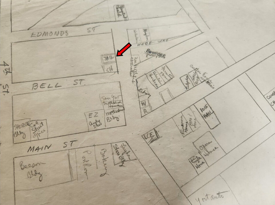 There are no known pictures of Edmonds’ first city jail or its exact location. However, gleaning from several City Council meeting notes and other early memoirs it’s believed that the jail was located on the northwest side of 5th Avenue North between Bell and Edmonds Streets. In the late 1800s that location would have been away from the growing downtown area, on the north border of the city limits and near another wooden building that was used part time as Edmonds City Hall.