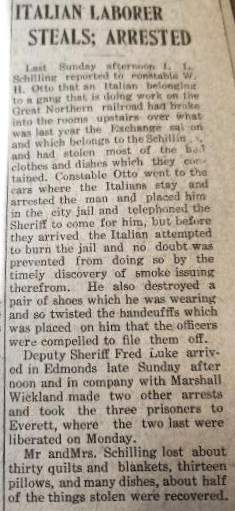 In looking at articles up to 1910 in the Edmonds Tribune-Review regarding arrests and people being jailed, the preponderance of the offenses had to do with 1) petty thefts, 2) people who were acting irrationally/possibly insane, or 3) people who were temporarily being held before being transported to the county jail.