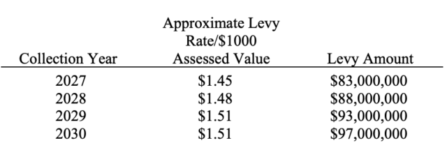 If approved by voters, the District would collect $83 million in 2027 ($1.45/$1,000 assessed property value) rising to $97 million in 2030 ($1.51/$1,000). The funds would pay for necessary educational programs, instructional materials, athletics, transportation and operations support not fully funded by the state, the District said. This measure renews existing funding rather than instituting a new levy, Board Members said at a previous meeting.
