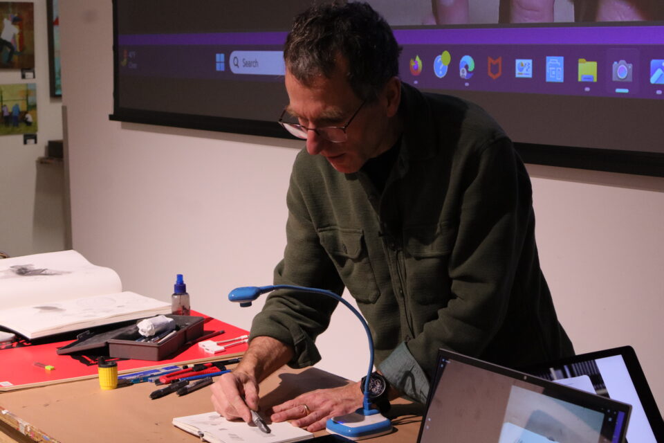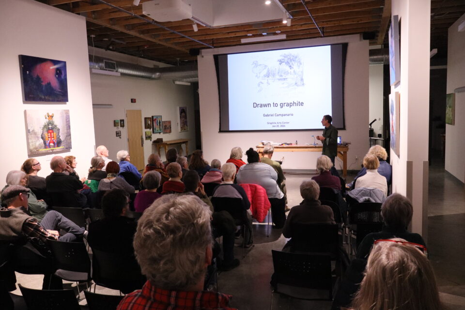 The main room at Graphite Arts Center was quiet as a library Tuesday evening as 40 people watched Urban Sketchers founder Gabriel “Gabi” Campanario. He cross-hatched and brushed a pencil across the sketchbook as he copied a drawing of a stone arch in a ravine. In 10 minutes, the vague outlines turned into a black-and-white illustration one might find in Rembrandt’s sketchbook.