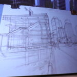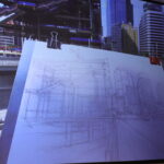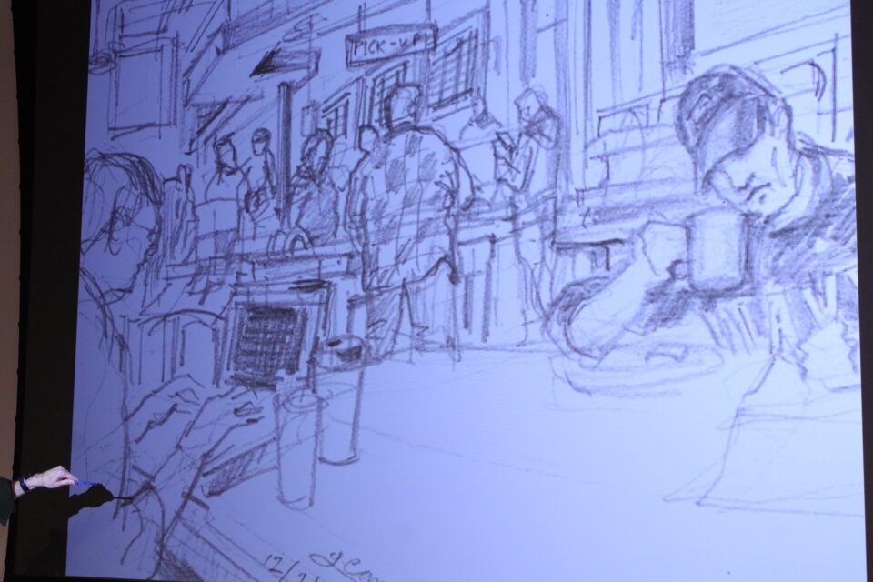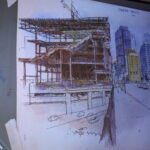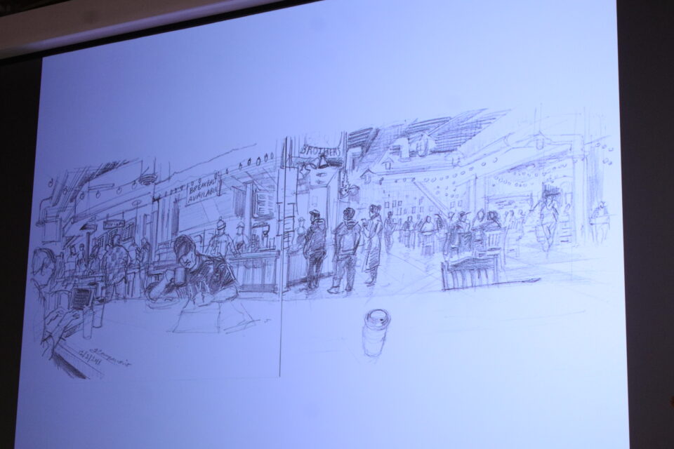 Campanario showed several sketches that highlighted the process of making more complex sketches, such as the construction of a building in downtown Seattle.