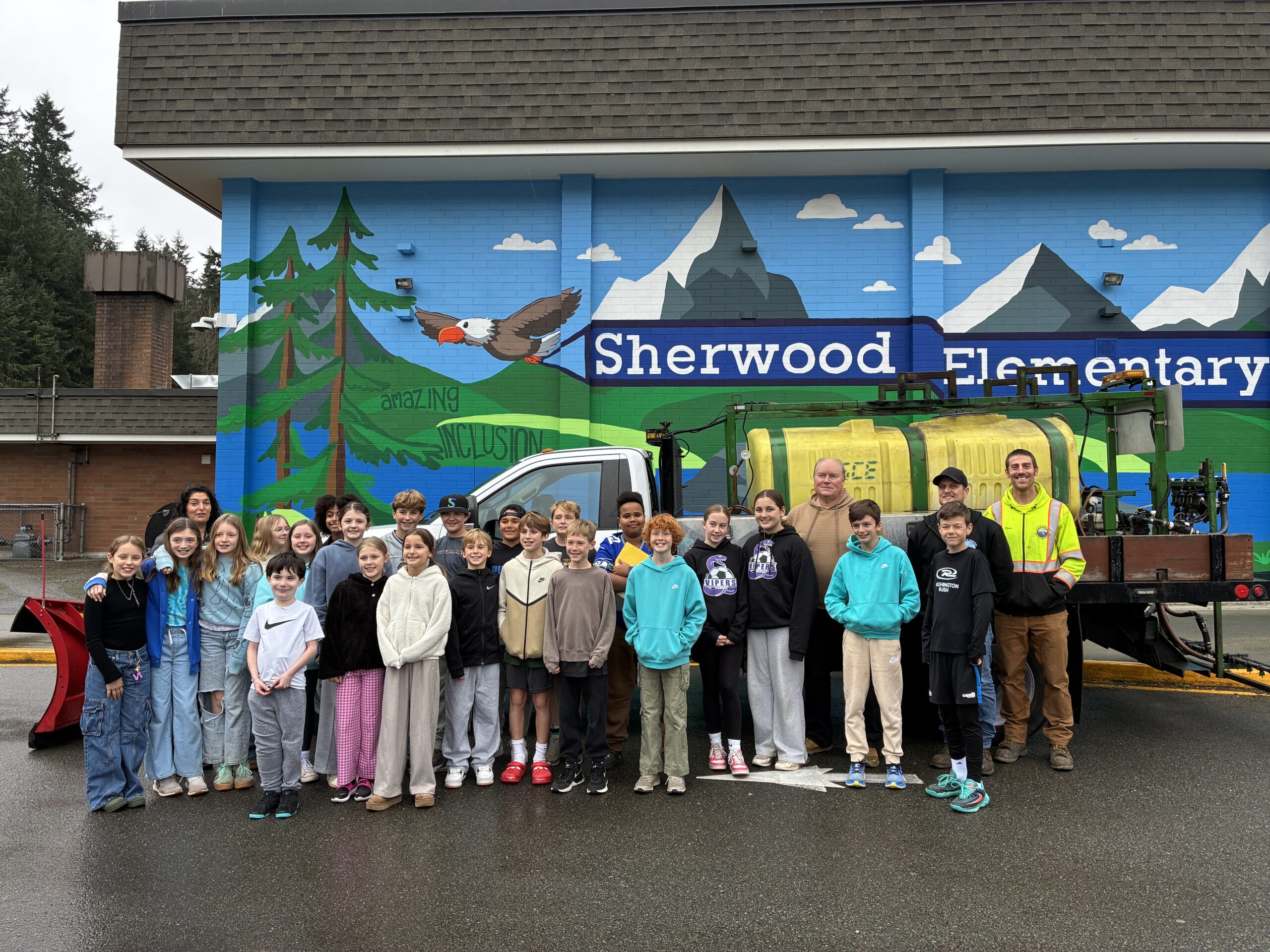 At Sherwood Elementary, excitement was especially high when students saw Ice Ice Baby roll onto campus — a fitting name, as the truck carries deicing materials.