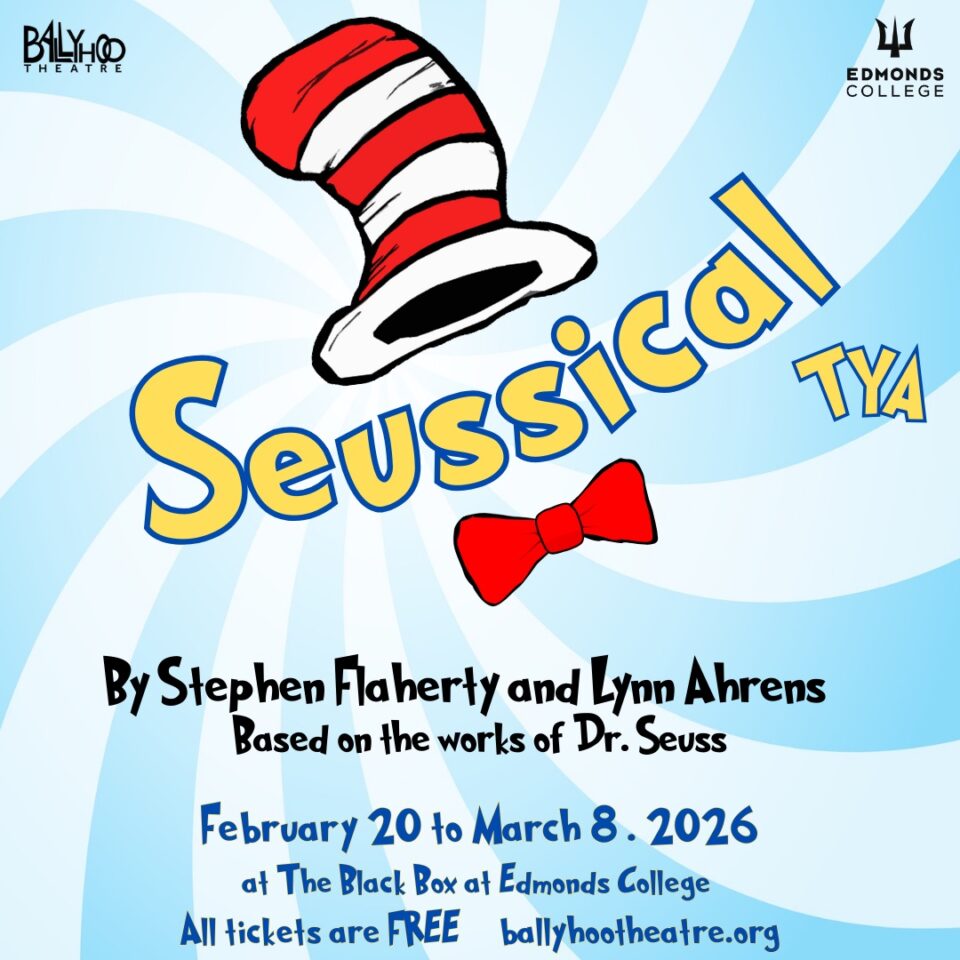 Ballyhoo Theatre Mainstage and Edmonds College brings Dr. Seuss to life in Seussical TYA (Theatre for Youth Audiences). Tony winners Lynn Ahrens and Stephen Flaherty introduce favorite Seuss characters, including Horton the Elephant, the Cat in the Hat, Gertrude McFuzz, Lazy Mayzie and Jojo, a little boy with a big imagination.