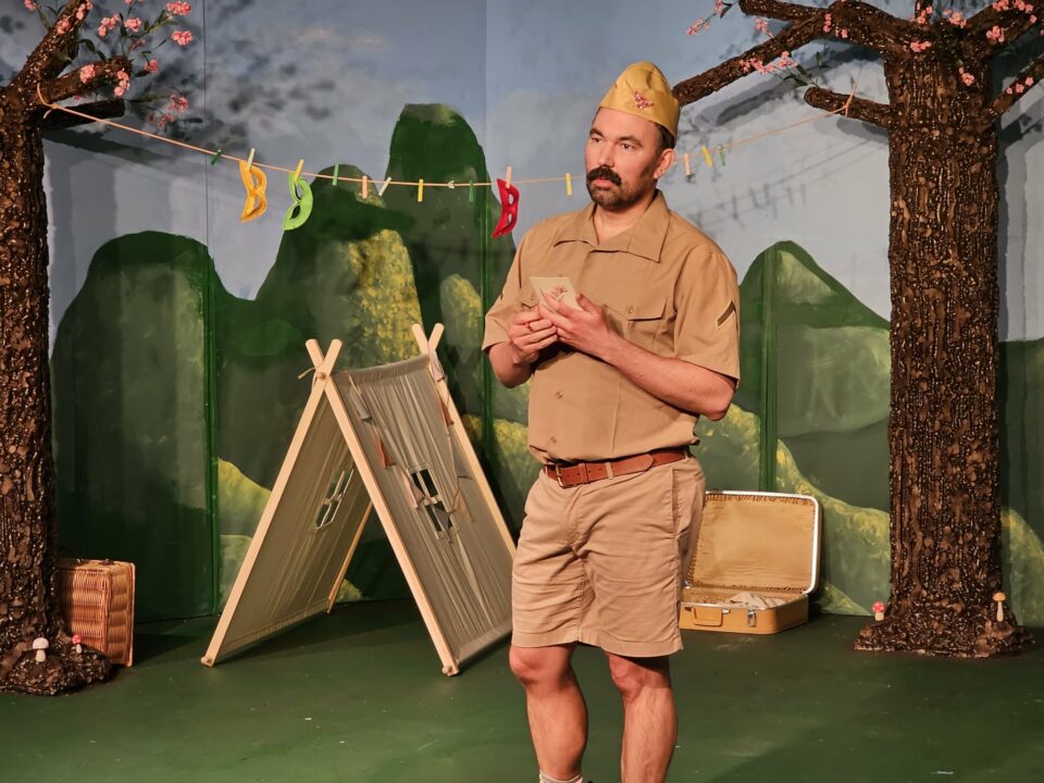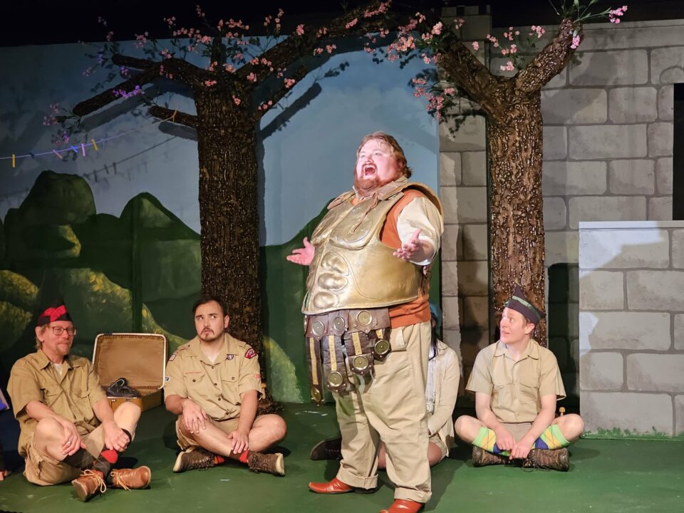 Don Armado appears with a rapier and clad in leather, James Lynch perfectly embodies the character’s bravado and excess. Lynch is spectacular in the role, eliciting hoots and hollers from the audience. One viewer even exclaimed, “He is good!” Lynch’s comic timing and physicality consistently land.