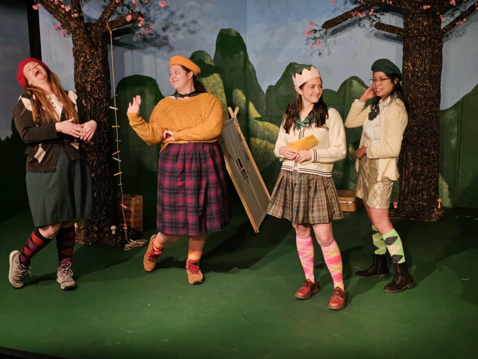 The ladies, also reminiscent of a troupe of Girl Scouts, arrive in argyle socks, plaid skirts and berets. Led by MaryKate Kustas as the Princess of France, Kustas balances wit with restraint, grounding the play. Lady Maria (Nguyen), Lady Katherine (Lael) and Lady Rosaline (Britta R. Grass) form a cohesive, gossiping, mischievous ensemble. Grass plays both Lady Rosaline and Nathaniel and is particularly funny and sassy.