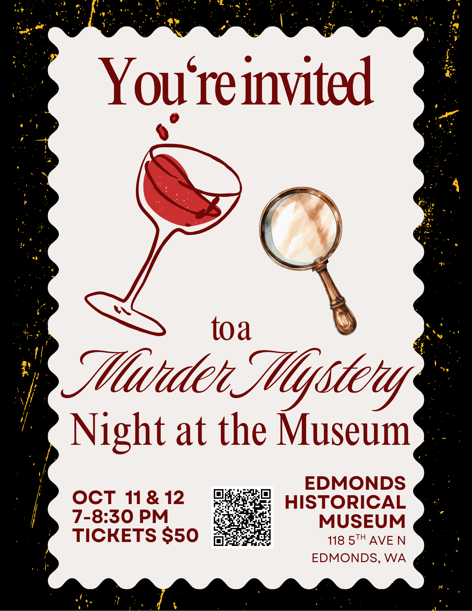Tickets include participation in the event, complimentary hors d’oeuvres, and non-alcoholic beverages, alcoholic beverages will be available for purchase during the event. All proceeds go to support the Edmonds Historical Museum, a 501c3 nonprofit.