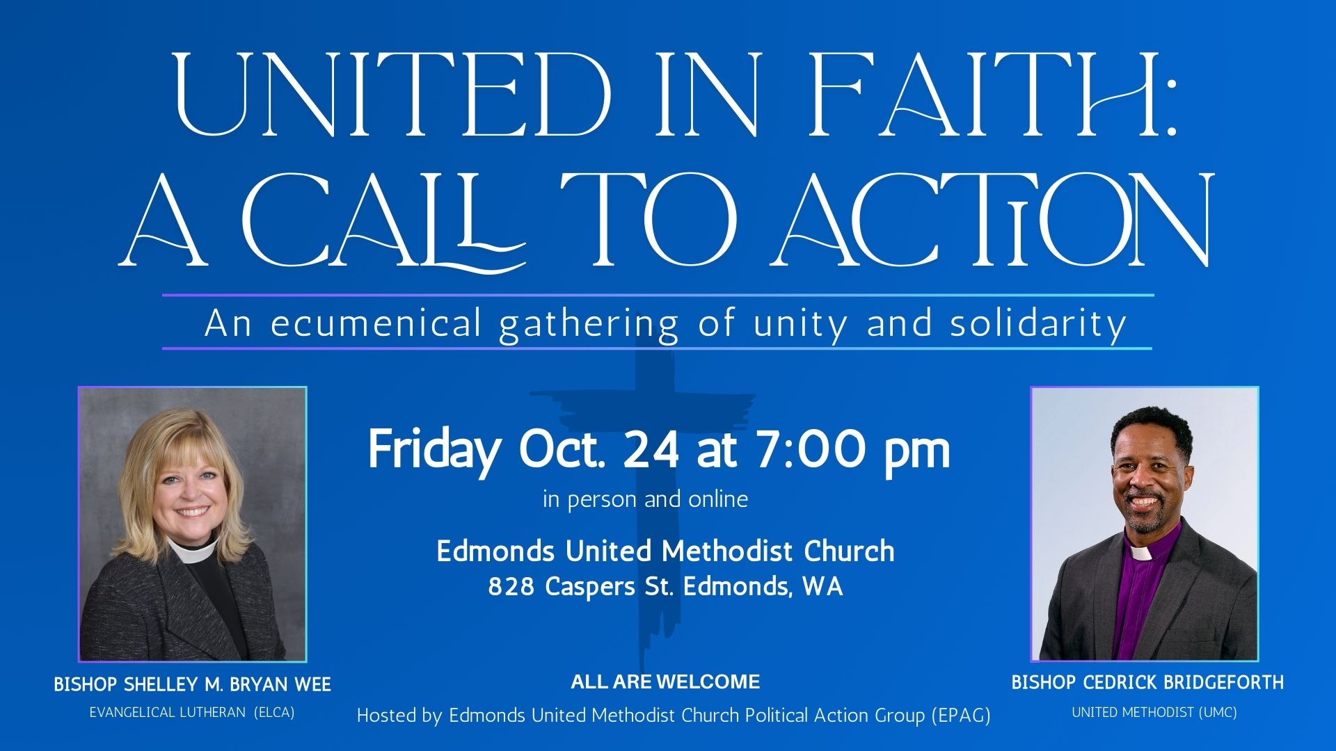United in Faith is a gathering of progressive people of faith who are opposed to how the Christian faith is being weaponized to legitimize authoritarian power and suppress dissenting voices. We gather united in love for our neighbors, for justice, truth, and commitment to the common good of all in our country. Our speakers are Bishop Shelley M. Bryan Wee, Bishop in the Northwest Washington Synod of the Evangelical Lutheran Church, and Bishop Cedrick D. Bridgeforth, residential bishop of the Greater Northwest Episcopal Area of the United Methodist Church. The event is in-person and online.
